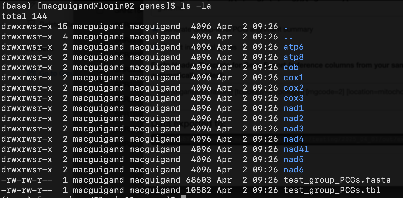 Once complete, MitoPilot will print the location of the exported files. By default, that location is YOUR_PROJECT_DIRECTORY/out/export/YOUR_GROUP_NAME.